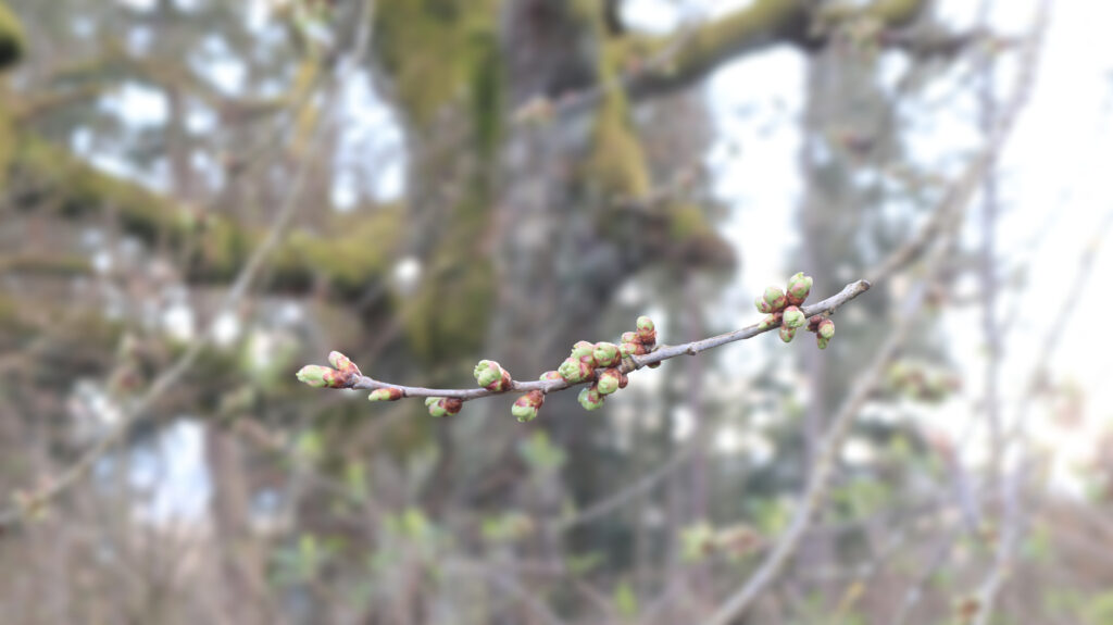 Es dauert lange bis ich die Einstellungen an der Kamera wieder parat habe: Genauso wie beim Handy klappt die Entfernungseinstellung nicht, um auf den einen Ast mit den Knospen scharf zu stellen. Die Entfernungseinstellung „rutscht“ immer wieder auf das dahinterliegende Astwerk, bis ich es auf manuell umgestellt habe. Inzwischen waren die anderen weitergegangen.